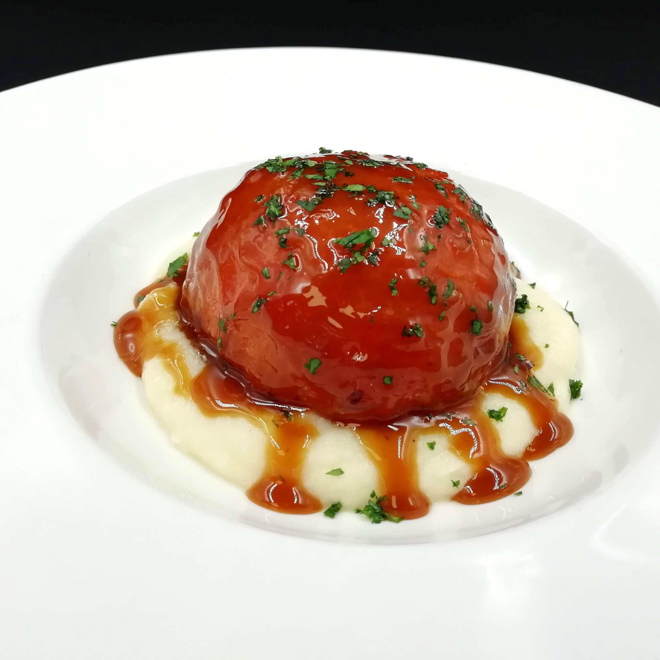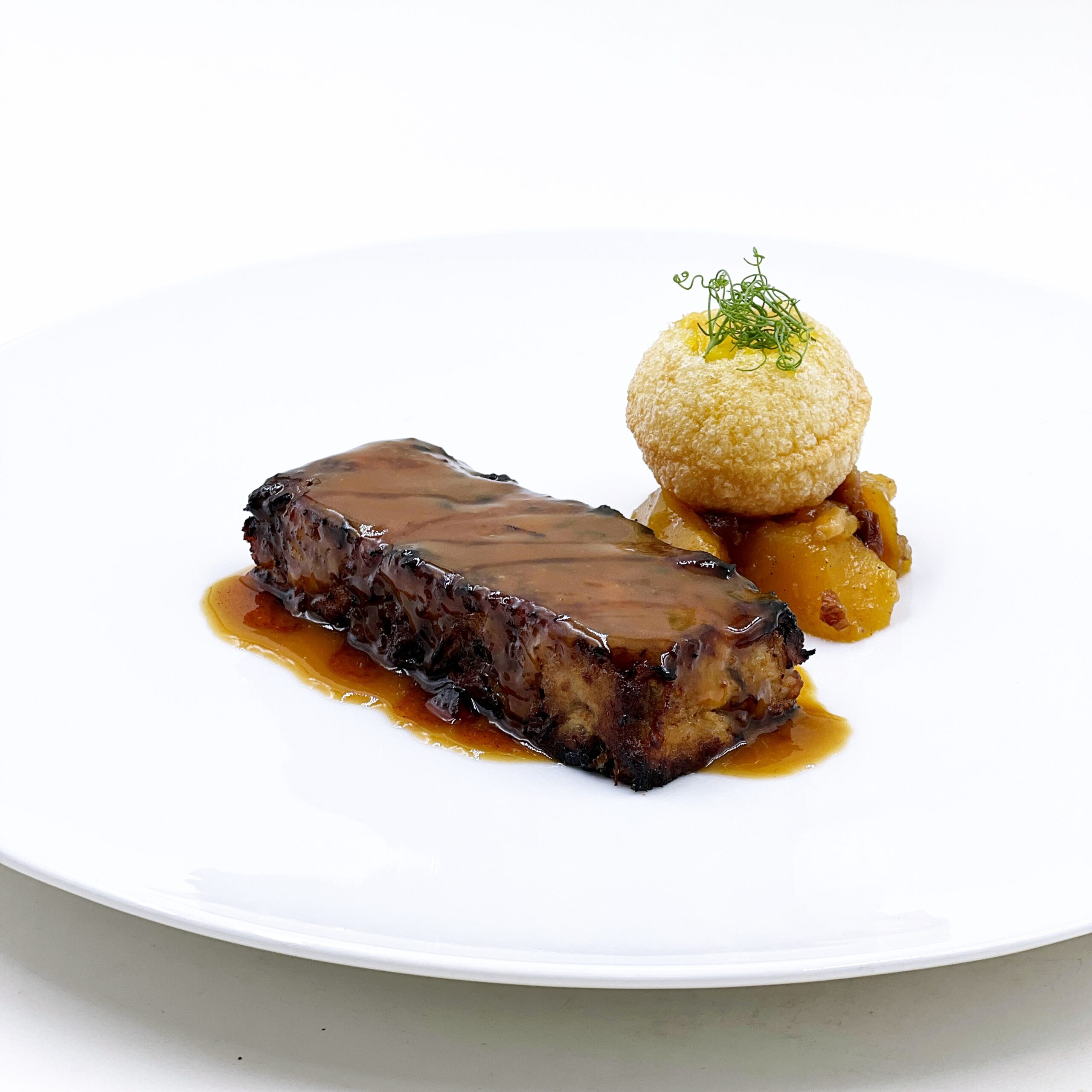 Costilla deshuesada con chutney de pera.