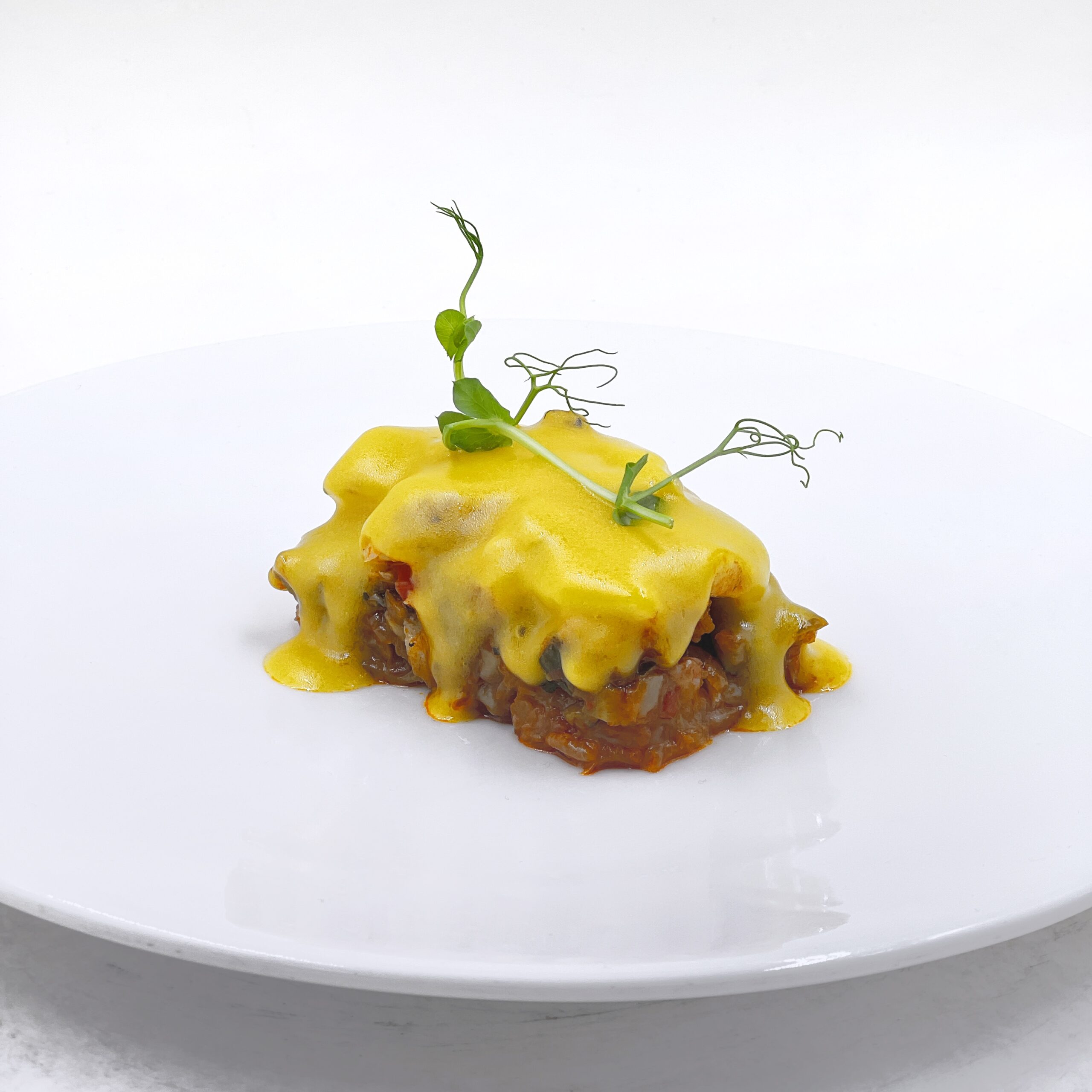 Huevo a baja temperatura con espuma de patata y bolognesa.