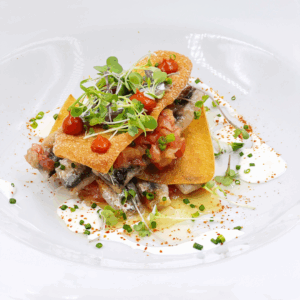 Anchoas marinadas, wonton, tomate concassé y ajoblanco.