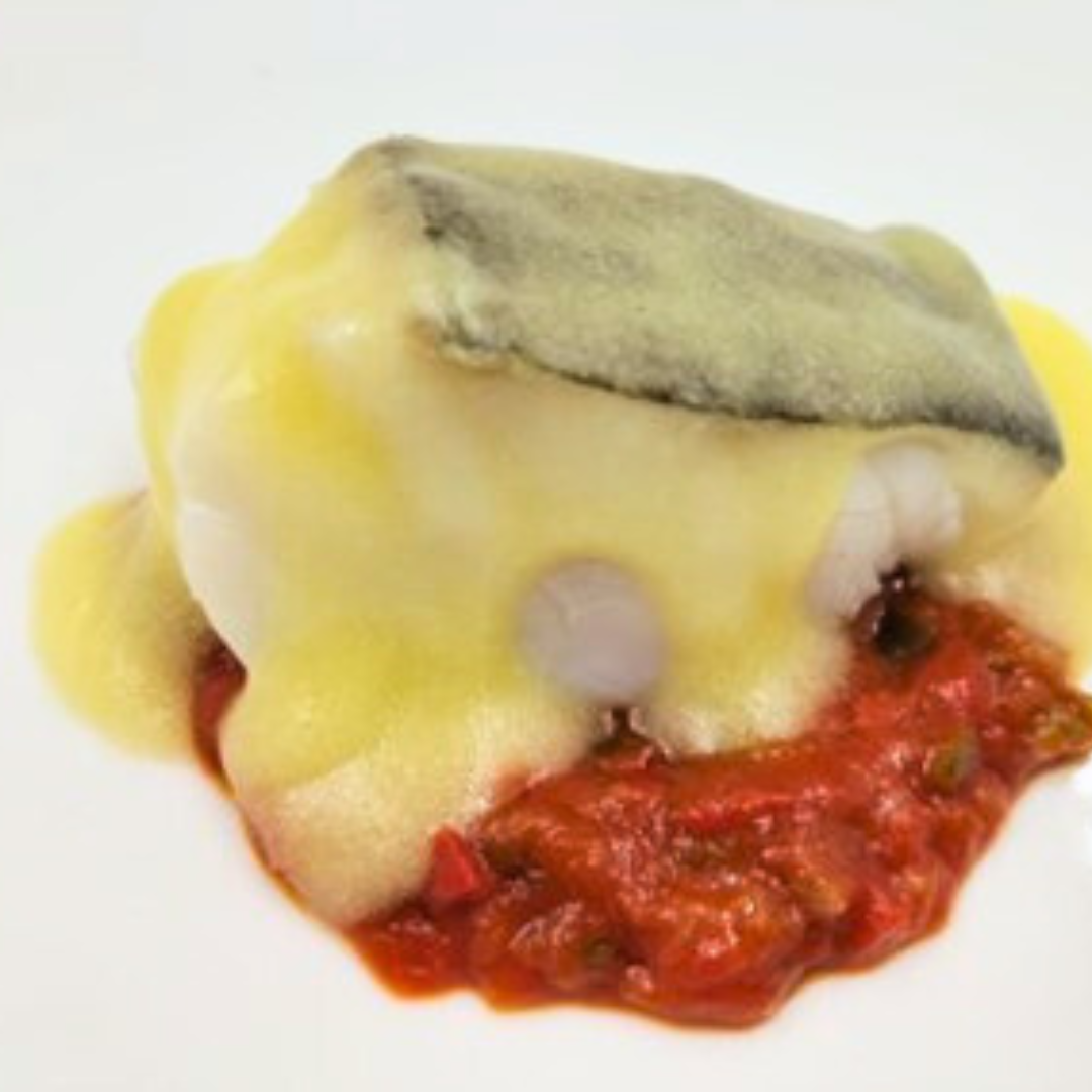 Pescado del día, pisto de calamares y salsa de piquillos.
