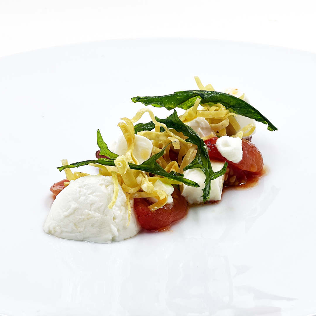Ensalada de tomate asado, rúcula, queso fresco y texturas de albahaca.