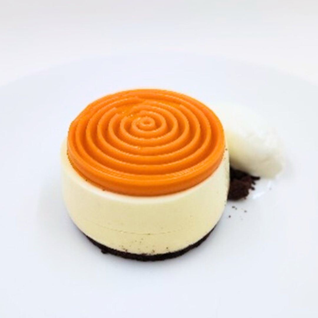 Tarta de queso fría de mango con helado de cacao.