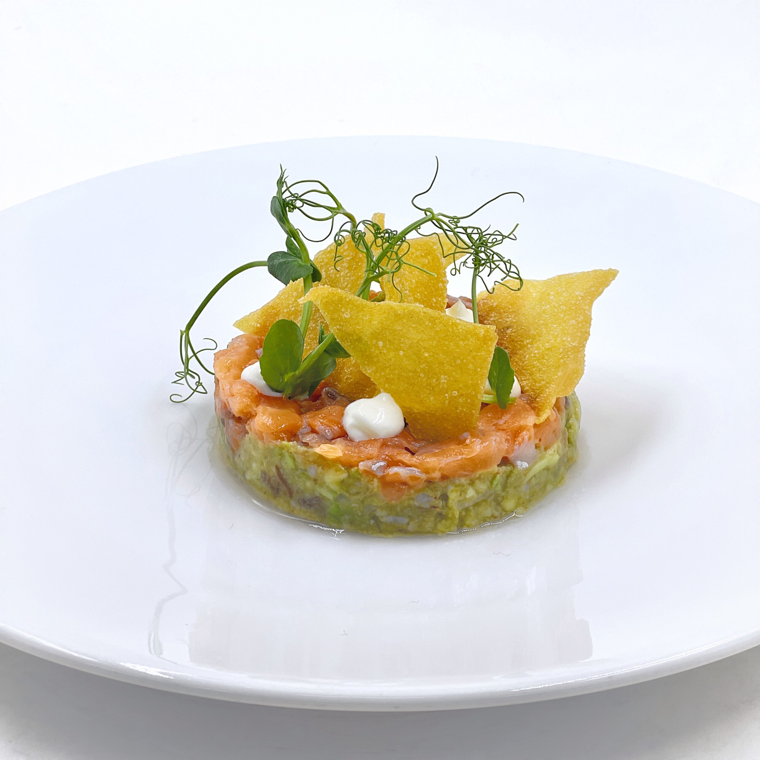 Tartar de salmón marinado, guacamole picante, tortitas de maíz frito y emulsión de queso.