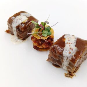 Terrina de carrillera de cerdo, milhojas de queso de cabra y emulsión de miel y mostaza.