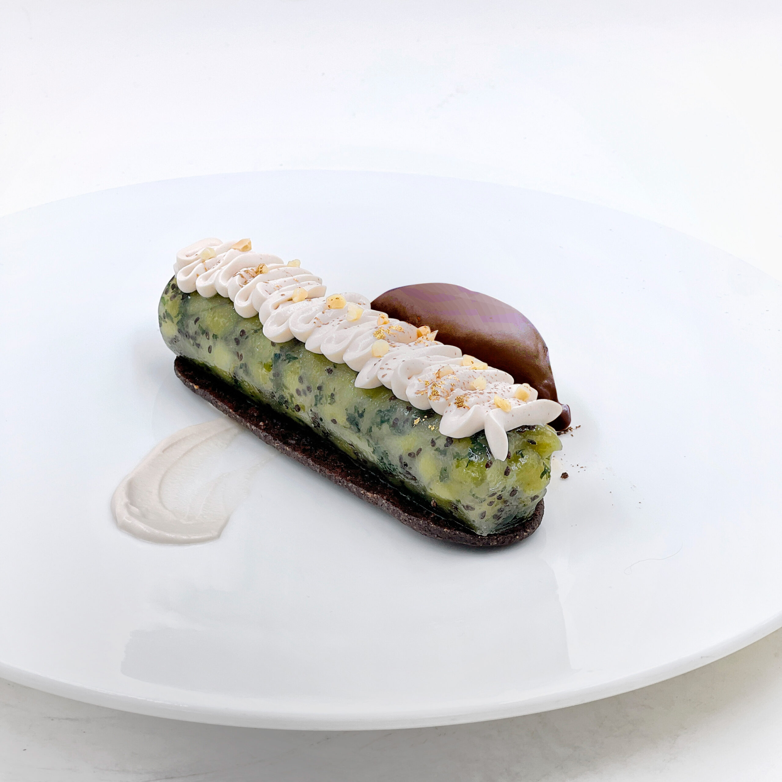Tatín de kiwi y albahaca, sableux de chocolate negro, ganache de mascarpone y helado de cacao.