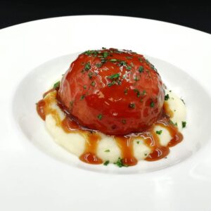 Tomate relleno de ternera, hinojo y aceite de perejil.