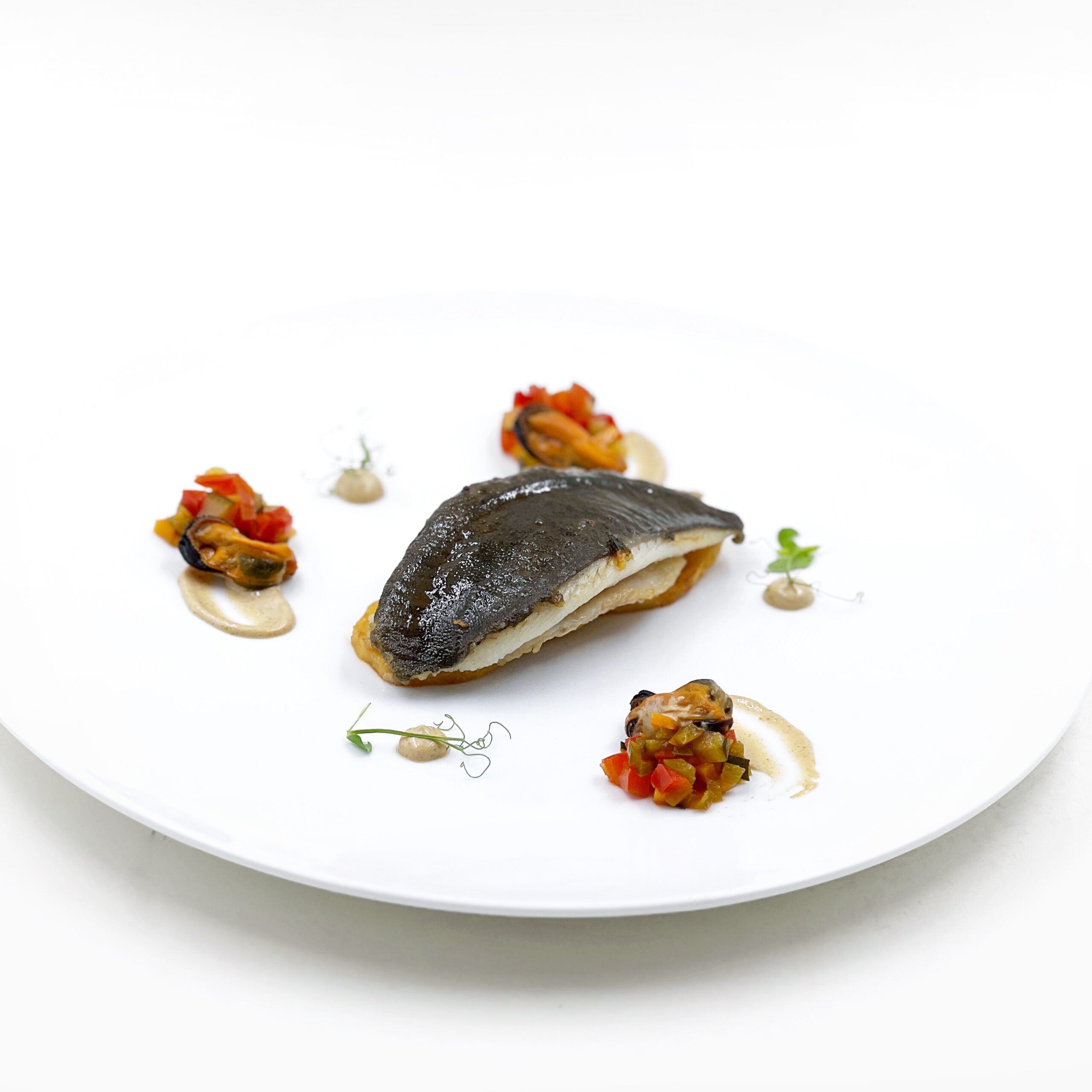 Pescado del día, mejillones y verdura escabechada.