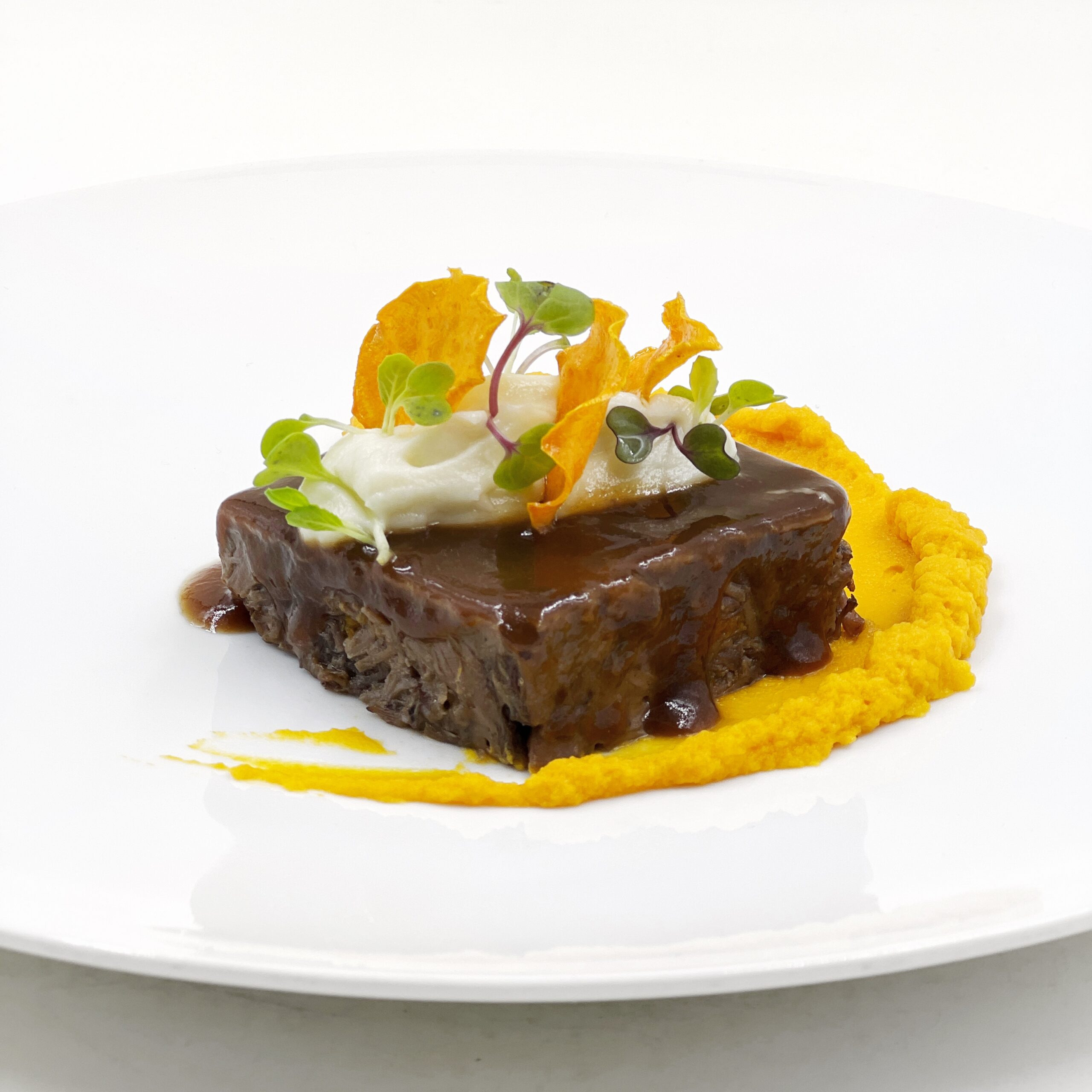 Rabo deshuesado con boniato y coliflor.