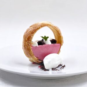 Panacotta de frambuesa con cremoso de chocolate negro y helado de yogur.