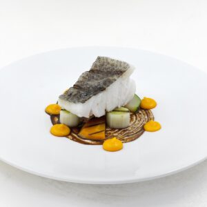 Láminas de bacalao con pil-pil de calabaza y salsa negra.