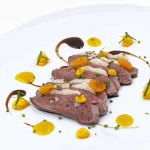 Magret de pato, salsa oriental, kumquat y gel de naranja.